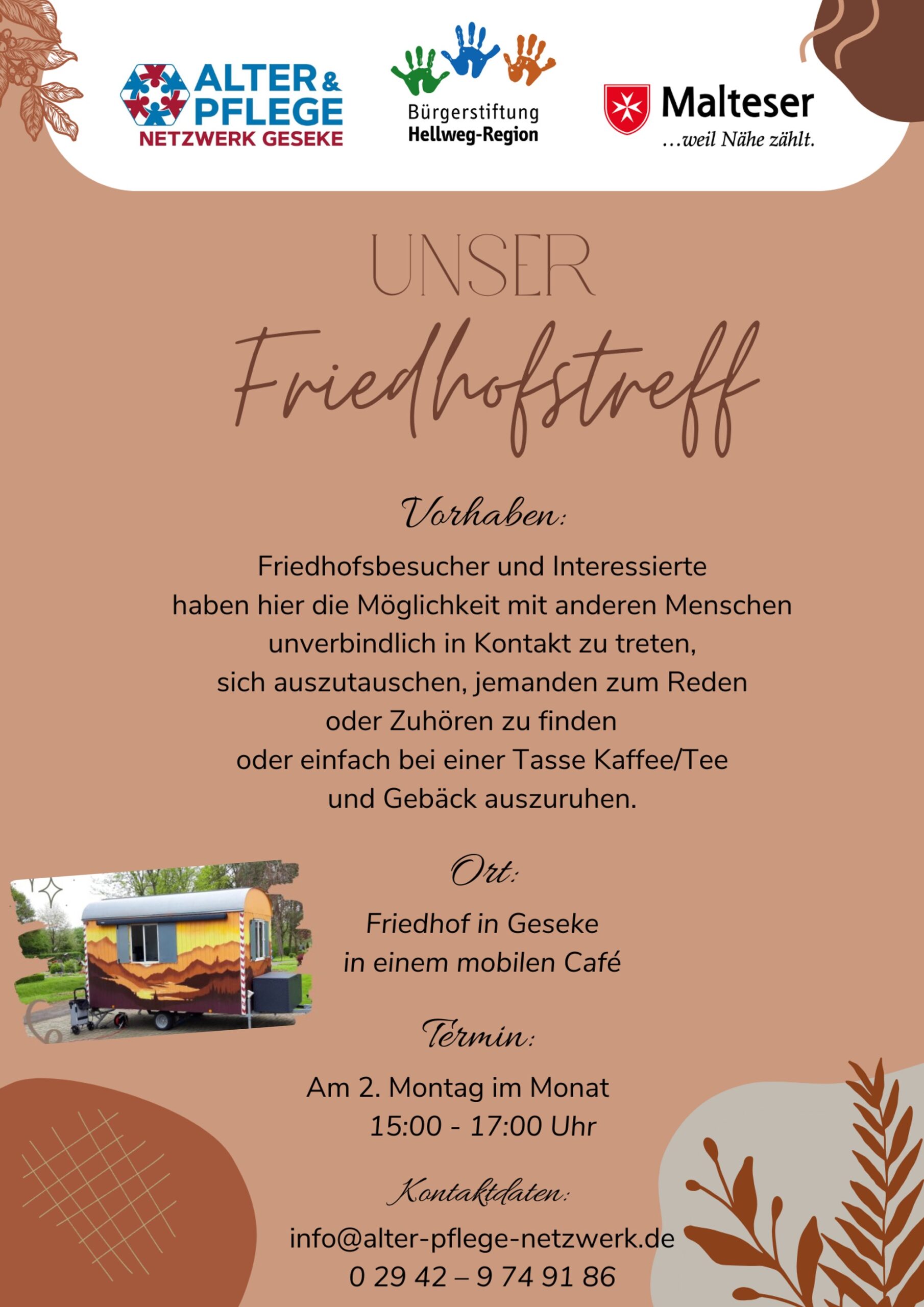Friedhofsbesucher und Interessierte haben hier die Möglichkeit mit anderen Menschen unverbindlich in Kontakt zu treten, sich auszutauschen, jemanden zum reden oder Zuhören zu finden oder einfach bei einer Tasse Kaffee/Tee und Gebäck auszuruhen.