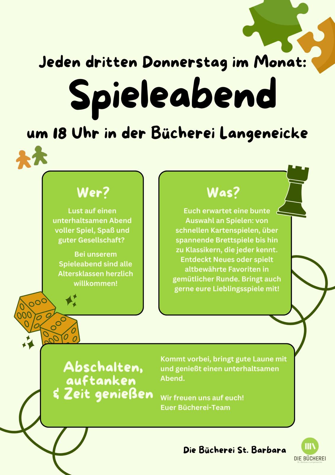 Du hast Lust auf einen unterhaltsamen Abend voller Spiel, Spaß und guter Gesellschaft? Beim Spieleabend der Bücherei Langeneicke sind alle Altersklassen herzlich willkommen!